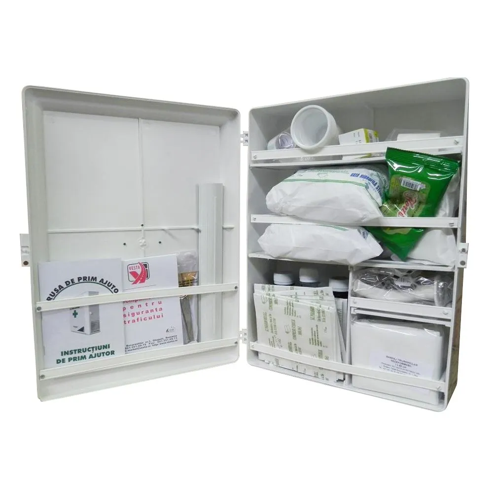 Trusa de prim ajutor pentru firme , dimensiune 385x285x115mm , este destinata pentru dotarea posturilor de prim ajutor fixe (sectii de productie, spatii comerciale si de depozitare, unitati de invatamant, cultura si arta, camine, autogari, aeroporturi, unitati de alimentatie publica si hoteliere, unitati prestatoare de servicii catre populatie etc).